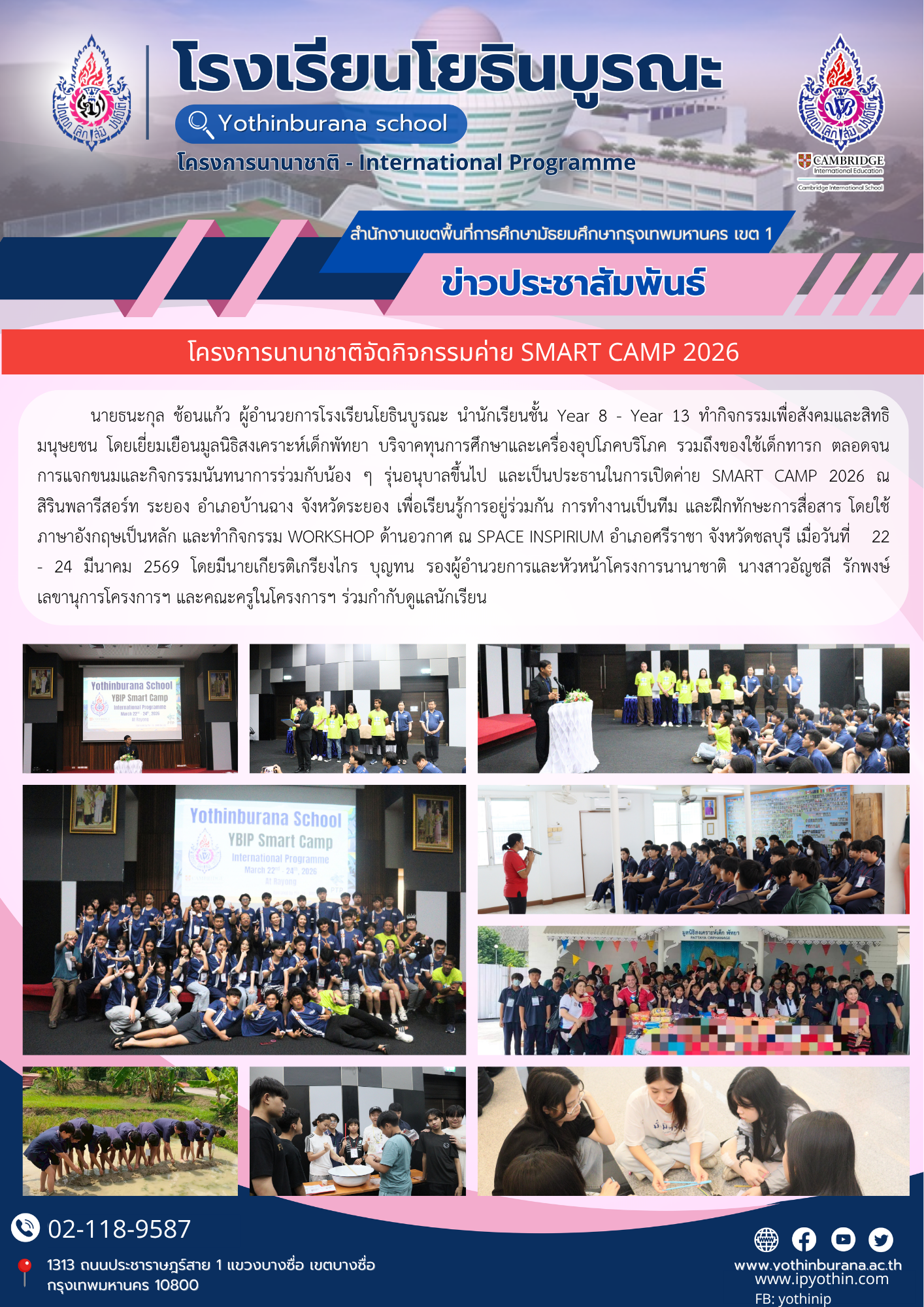 นายธนะกุล ช้อนแก้ว ผู้อำนวยการโรงเรียนโยธินบูรณะ นำนักเรียนชั้น Year 8 - Year 13 ทำกิจกรรมเพื่อสังคมและสิทธิ มนุษยชน โดยเยี่ยมเยือนมูลนิธิสงเคราะห์เด็กพัทยา บริจาคทุนการศึกษาและเครื่องอุปโภคบริโภค รวมถึงของใช้เด็กทารก ตลอดจนการแจกขนมและกิจกรรมนันทนาการร่วมกับน้อง ๆ รุ่นอนุบาลขึ้นไป และเป็นประธานในการเปิดค่าย SMART CAMP 2026 ณ สิรินพลารีสอร์ท ระยอง อำเภอบ้านฉาง จังหวัดระยอง เพื่อเรียนรู้การอยู่ร่วมกัน การทำงานเป็นทีม และฝึกทักษะการสื่อสาร โดยใช้ภาษาอังกฤษเป็นหลัก และทำกิจกรรม WORKSHOP ด้านอวกาศ ณ SPACE INSPIRIUM อำเภอศรีราชา จังหวัดชลบุรี เมื่อวันที่ 22 - 24 มีนาคม 2569 โดยมีนายเกียรติเกรียงไกร บุญทน รองผู้อำนวยการและหัวหน้าโครงการนานาชาติ นางสาวอัญชลี รักพงษ์ เลขานุการโครงการฯ และคณะครูในโครงการฯ ร่วมกำกับดูแลนักเรียน