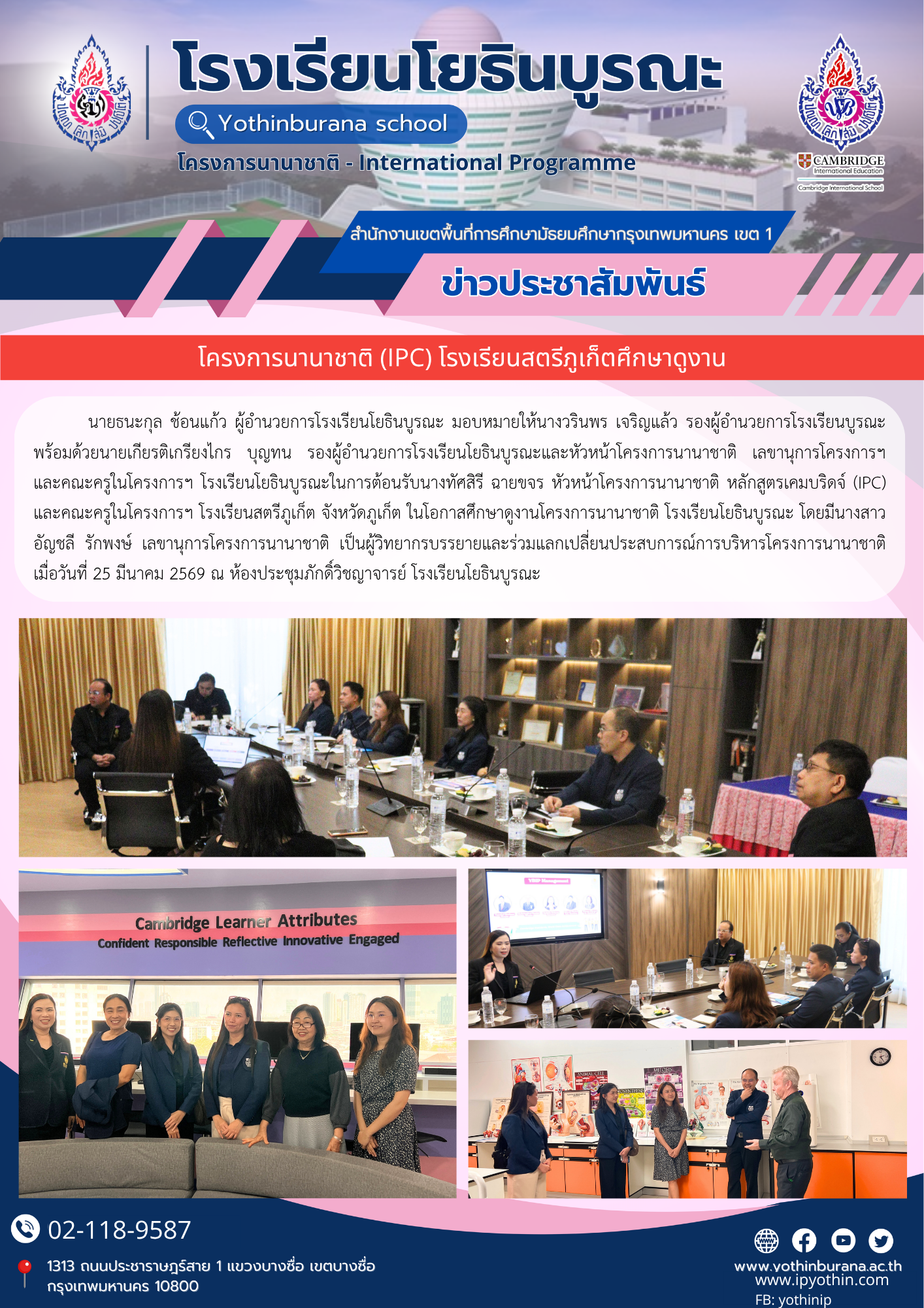 นายธนะกุล ช้อนแก้ว ผู้อำนวยการโรงเรียนโยธินบูรณะ มอบหมายให้นางวรินพร เจริญแล้ว รองผู้อำนวยการโรงเรียนบูรณะ พร้อมด้วยนายเกียรติเกรียงไกร บุญทน รองผู้อำนวยการโรงเรียนโยธินบูรณะและหัวหน้าโครงการนานาชาติ เลขานุการโครงการฯ และคณะครูในโครงการฯ โรงเรียนโยธินบูรณะในการต้อนรับนางทัศสิรี ฉายขจร หัวหน้าโครงการนานาชาติ หลักสูตรเคมบริดจ์ (IPC) และคณะครูในโครงการฯ โรงเรียนสตรีภูเก็ต จังหวัดภูเก็ต ในโอกาสศึกษาดูงานโครงการนานาชาติ โรงเรียนโยธินบูรณะ โดยมีนางสาวอัญชลี รักพงษ์ เลขานุการโครงการนานาชาติ เป็นผู้วิทยากรบรรยายและร่วมแลกเปลี่ยนประสบการณ์การบริหารโครงการนานาชาติ เมื่อวันที่ 25 มีนาคม 2569 ณ ห้องประชุมภักดิ์วิชญาจารย์ โรงเรียนโยธินบูรณ