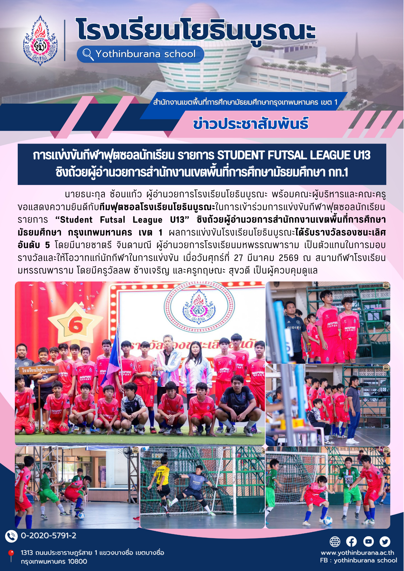นายธนะกุล ช้อนแก้ว ผู้อำนวยการโรงเรียนโยธินบูรณะ พร้อมคณะผู้บริหารและคณะครู ขอแสดงความยินดีกับทีมฟุตซอลโรงเรียนโยธินบูรณะในการเข้าร่วมการแข่งขันกีฬาฟุตซอลนักเรียน รายการ Student Futsal League U13 ชิงถ้วยผู้อำนวยการสำนักกงานเขตพื้นที่การศึกษามัธยมศึกษา กรุงเทพมหานคร เขต 1 ผลการแข่งขันโรงเรียนโยธินบูรณะได้รับรางวัลรองชนะเลิศอันดับ 5 โดยมีนายชาตรี จินดามณี ผู้อำนวยการโรงเรียนมหพรรณพาราม เป็นตัวแทนในการมอบรางวัลและให้โอวาทแก่นักกีฬาในการแข่งขัน เมื่อวันศุกร์ที่ 27 มีนาคม 2569 ณ สนามกีฬาโรงเรียนมหรรณพาราม โดยมีครูวัลลพ ช้างเจริญ และครูกฤษณะ สุขวดี เป็นผู้ควบคุมดูแล