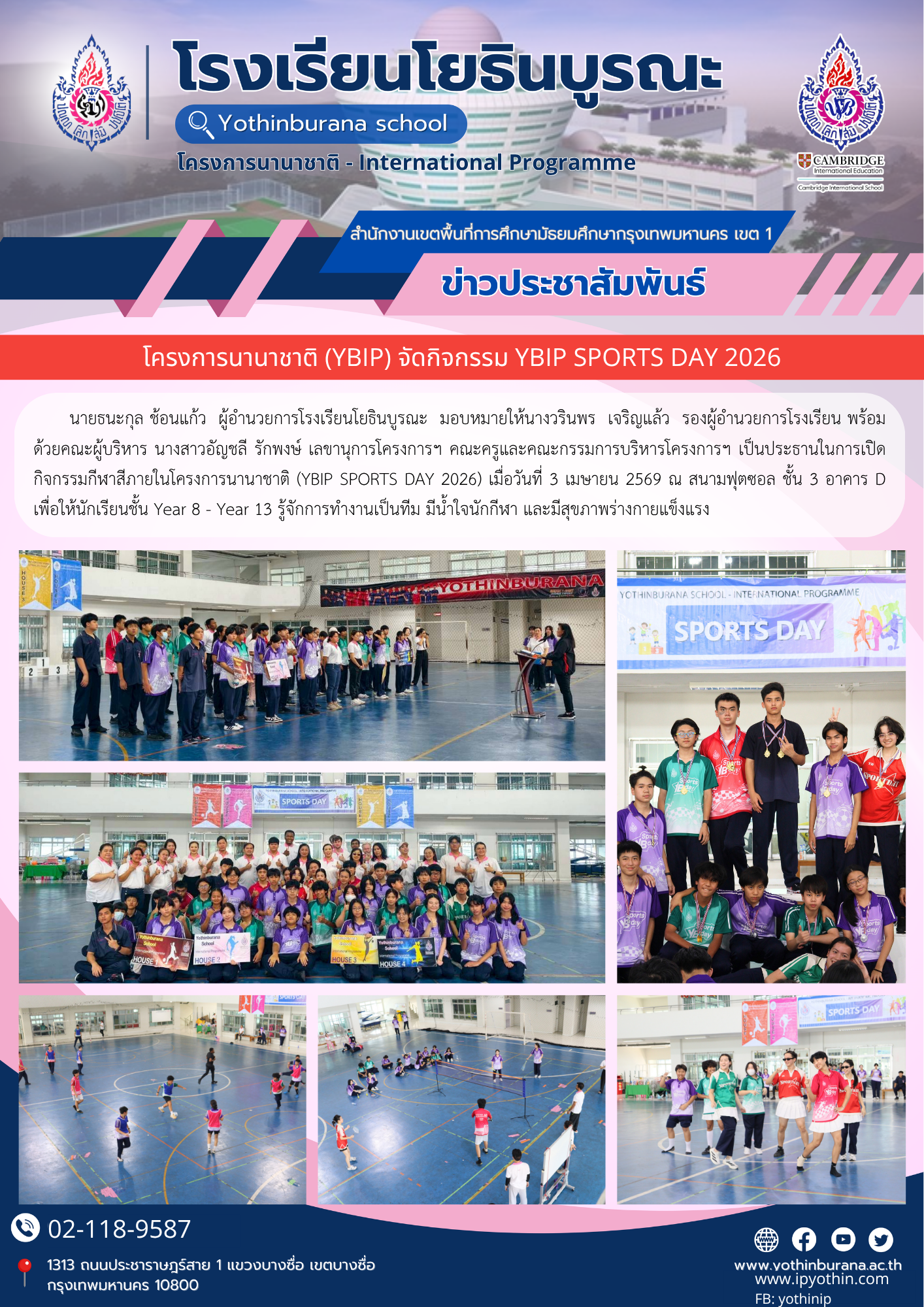 นายธนะกุล ช้อนแก้ว ผู้อำนวยการโรงเรียนโยธินบูรณะ มอบหมายให้นางวรินพร เจริญแล้ว รองผู้อำนวยการโรงเรียน พร้อมด้วยคณะผู้บริหาร นางสาวอัญชลี รักพงษ์ เลขานุการโครงการฯ คณะครูและคณะกรรมการบริหารโครงการฯ เป็นประธานในการเปิดกิจกรรมกีฬาสีภายในโครงการนานาชาติ (YBIP SPORTS DAY 2026) เมื่อวันที่ 3 เมษายน 2569 ณ สนามฟุตซอล ชั้น 3 อาคาร D เพื่อให้นักเรียนชั้น Year 8 - Year 13 รู้จักการทำงานเป็นทีม มีน้ำใจนักกีฬา และมีสุขภาพร่างกายแข็งแรง
