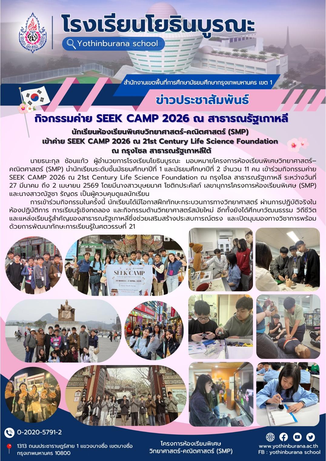 นายธนะกุล ช้อนแก้ว ผู้อำนวยการโรงเรียนโยธินบูรณะ มอบหมายโครงการห้องเรียนพิเศษวิทยาศาสตร์คณิตศาสตร์ (SMP) นำนักเรียนระดับชั้นมัธยมศึกษาปีที่ 1 และมัธยมศึกษาปีที่ 2 จำนวน 11 คน เข้าร่วมกิจกรรมค่าย SEEK CAMP 2026 ณ 21st Century Life Science Foundation ณ กรุงโซล สาธารณรัฐเกาหลี ระหว่างวันที่ 27 มีนาคม ถึง 2 เมษายน 2569 โดยมีนางสาวบุษยมาศ โชติกประคัลภ์ เลขานุการโครงการห้องเรียนพิเศษ (SMP) และนางสาวณัฐชา รัญดร เป็นผู้ควบคุมดูแลนักเรียน